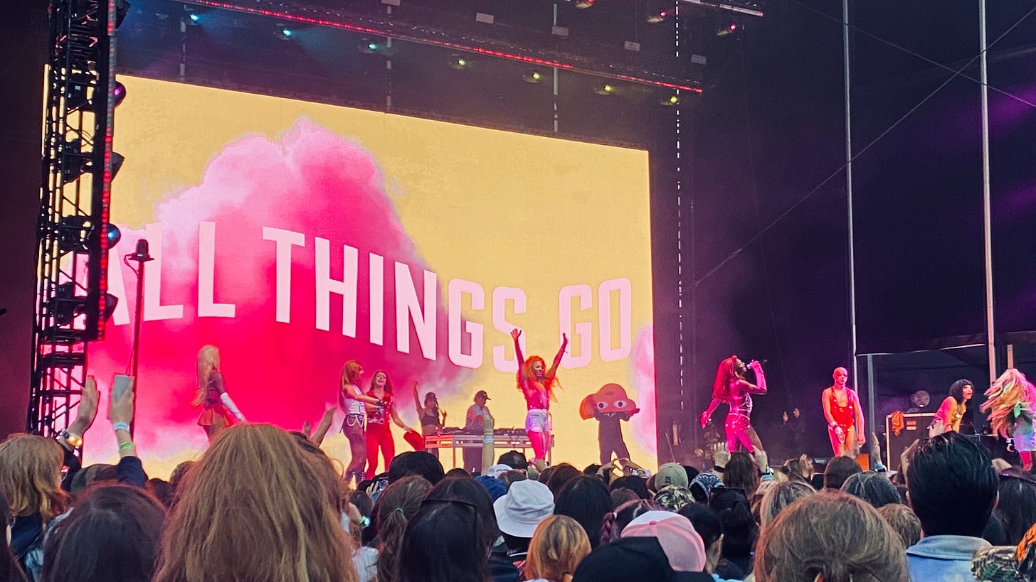 Still, here are the names of the enigmatic, radiant, grand Drag Queens who came out and performed at the 2024 All Things Go Festival, with little notice or preparation, and who gave their souls to the (somewhat lackluster) crowd: Beaujangles, Reese Havoc, Yvie Oddly, Hanukah Lewinsky, Dev Doee, Monique Heart, Mo’Riah, Aqauria, and Kevin Aviance. Imagine a real life Lip Sync For Your Life with genuine underlying thunder beneath grey storm clouds on top of a crowd of queers in clear ponchos holding white claws, overpriced chicken tenders, and ranch seasoned fries. Monique Heart using her Drag Race mid-show interview skills and natural charisma to MC the set as Yvie Oddly fights past her health problems to vogue and whack as elegantly as she can, hinting at past possible contortions of her body. Voguing and posing. Backbends and one or two splits. Aquaria and Mo’Riah choreographing mid-performance, in motion and half-thought, during the real-time event.