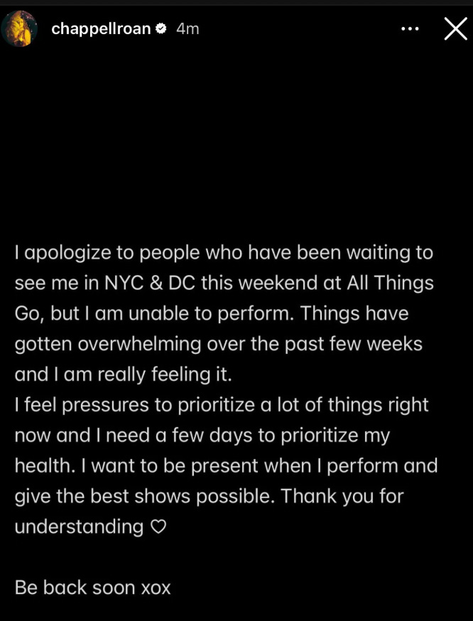 Chappell Roan’s late September Tuesday internet spectacle became a sudden Friday cancellation of her and her band from their set for the Saturday festival, all in one week. Mid-flight, train departure, or hotel check-in, thousands looked at an Instagram message of her canceling her appearance due to her mental health. With less than 24-hour notice, there was even a heart emoji for the urgency. At the same time, the $400 ticket prices fell to $40-50 for access to the two-day weekend.